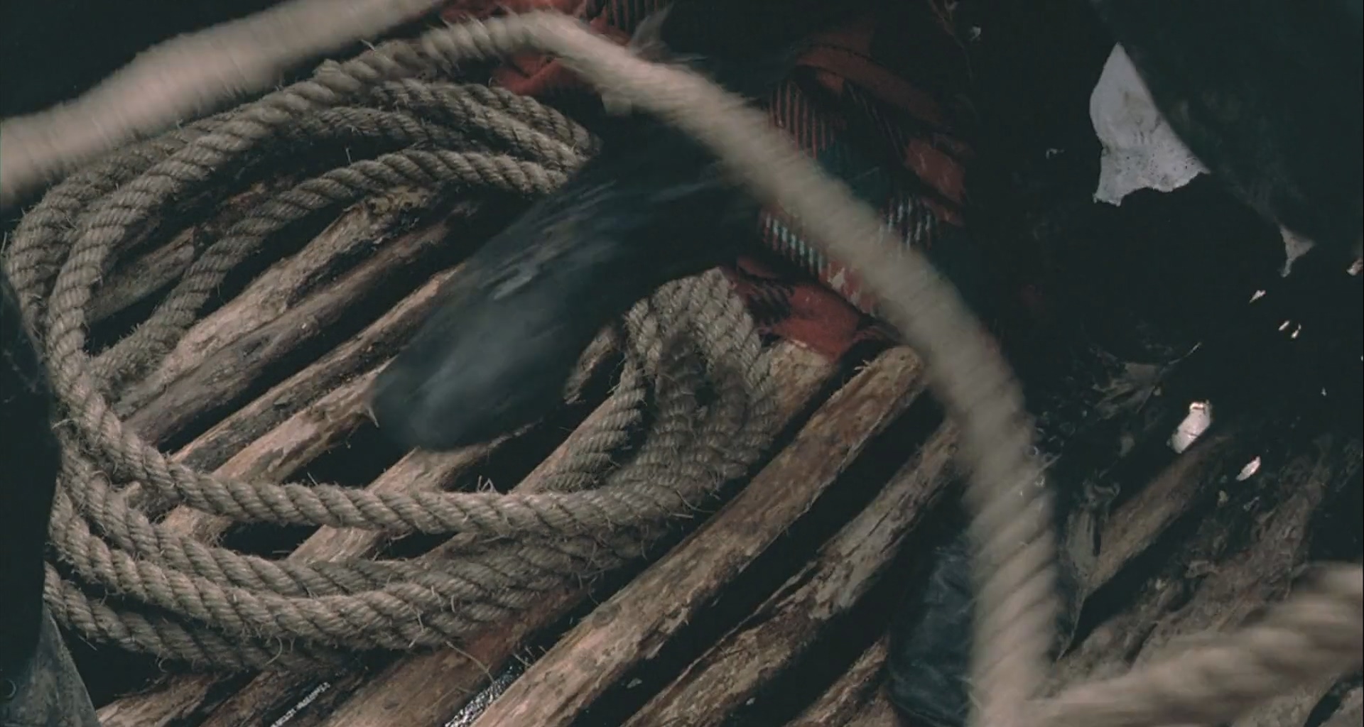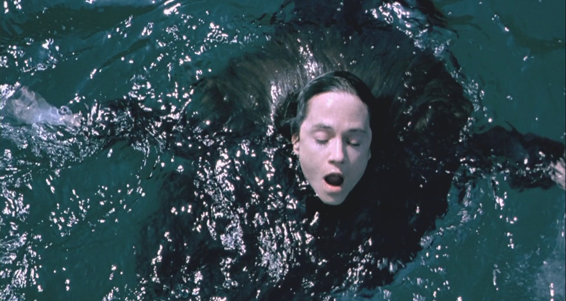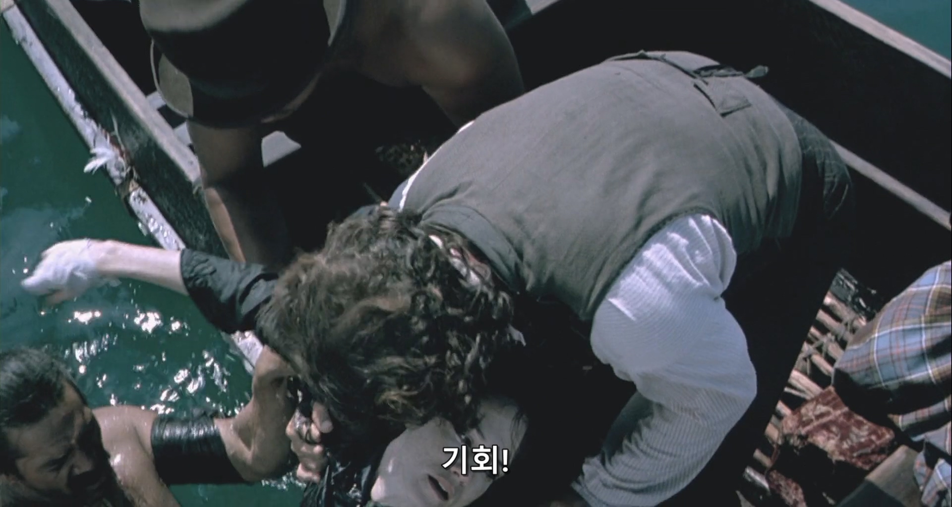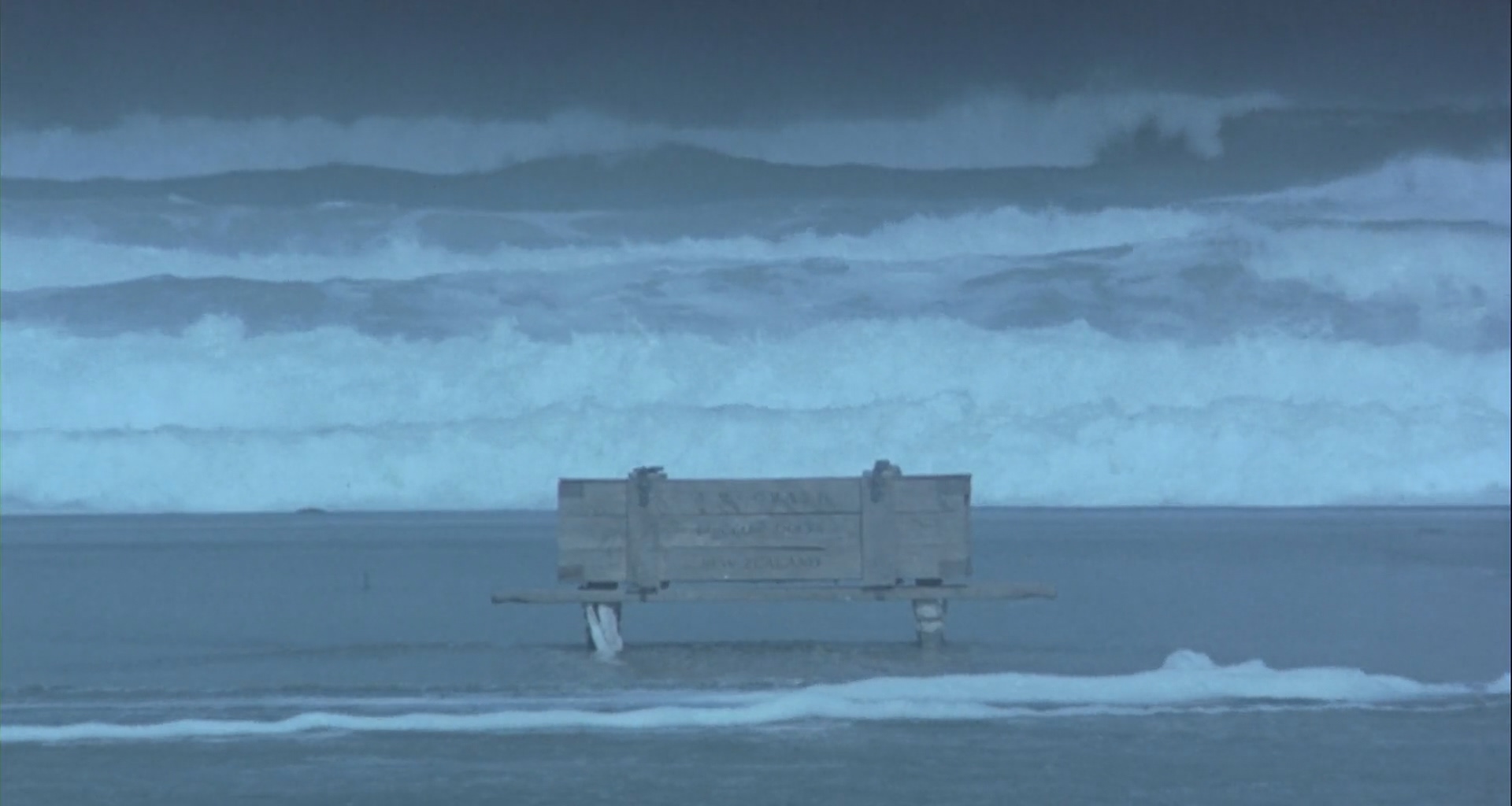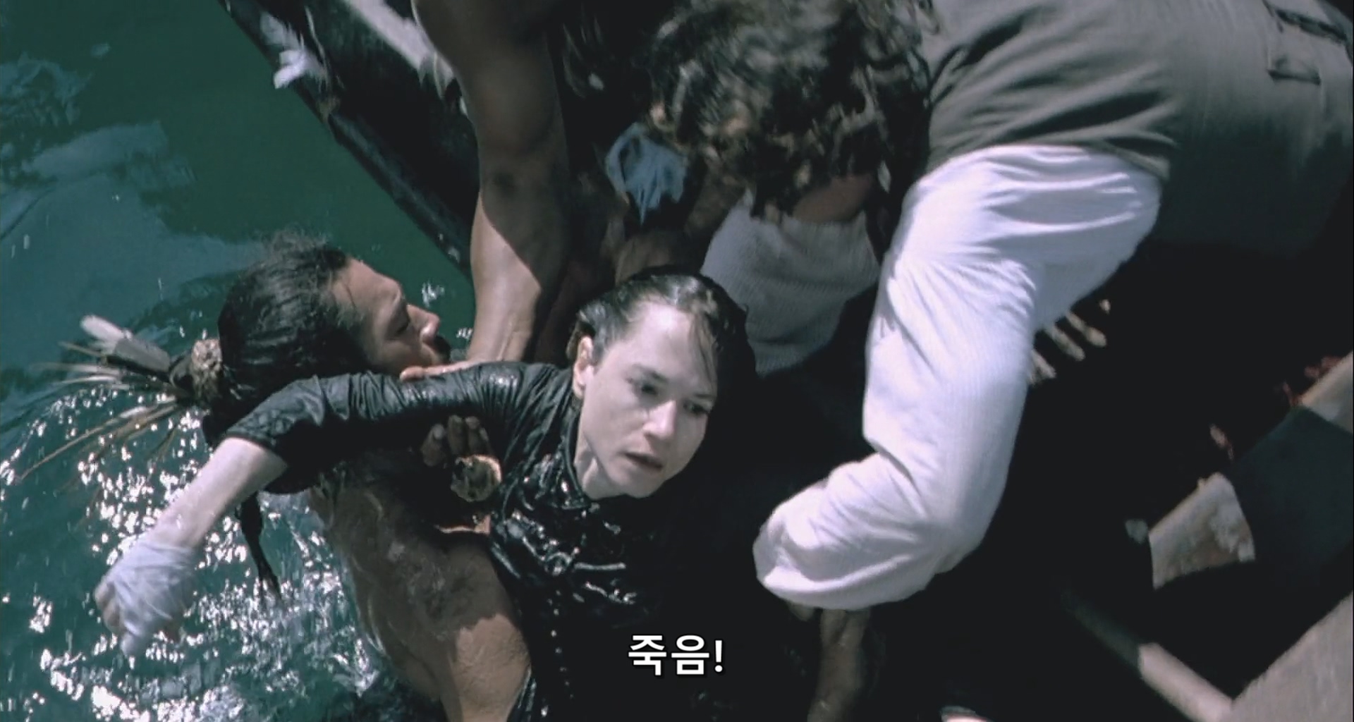 배가 얼 만큼 갔을까? 그녀는 피아노를 바다에 버려 달라고 한다. 과거와의 단절. 베인스와 원주민은 로프를 풀고 피아노를 바다 속으로 밀어 넣는다. 그 순간, 그녀는 로프 속에 발을 넣어 자신을 물속으로 던져 버립니다. 그녀는 왜 스스로 물속에 자신을 던져 버렸을가요? 과거와의 단절, 죽음과 새로운 기회, 희망이 교차 되는 순간이다.